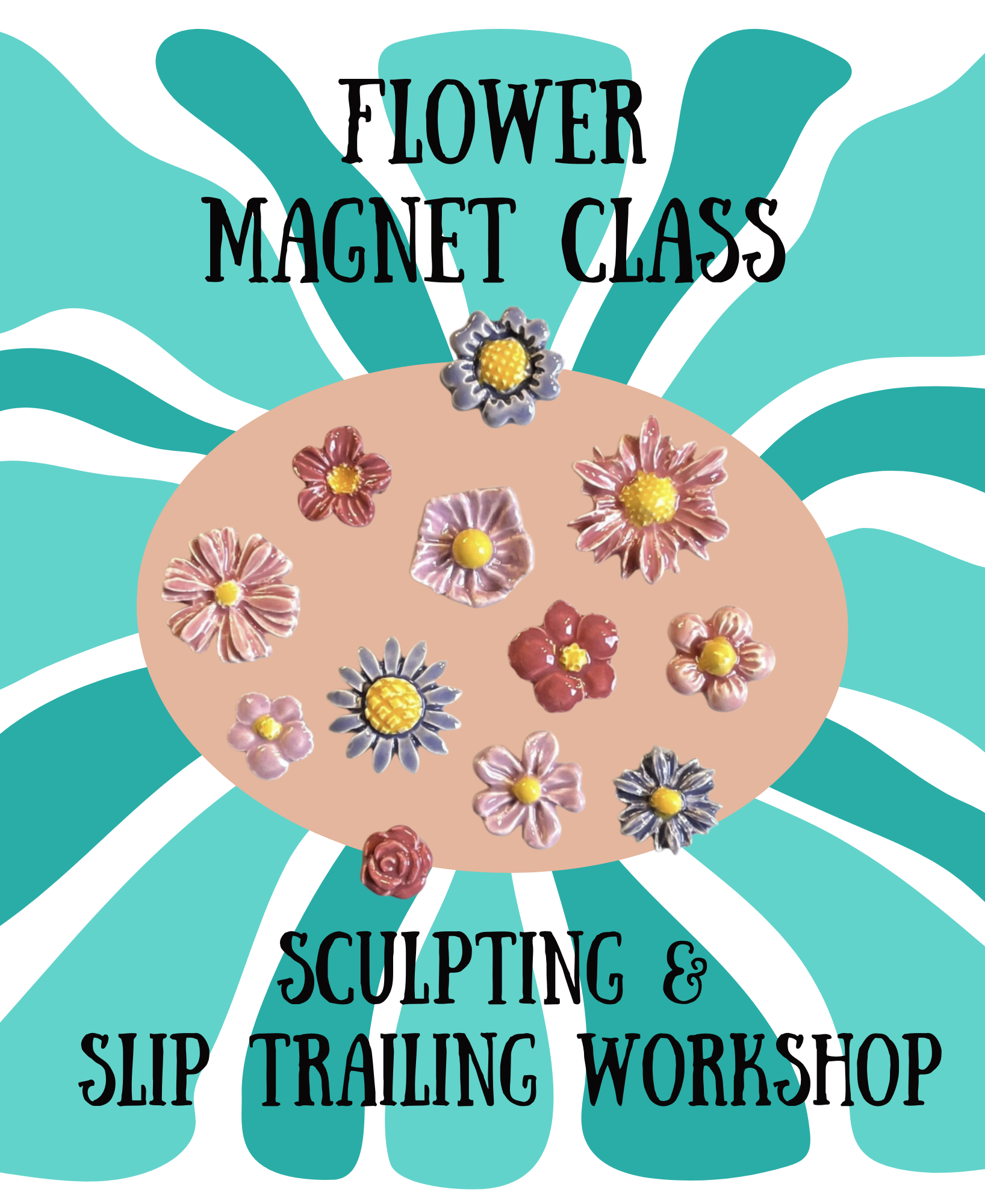 Create your own magnets to adorn your fridge! In this 2 hr workshop you will learn several different hand building/sculpting & decorating techniques while you make your own floral bouquet. Each person can make up to 6 magnets. Ages 13+